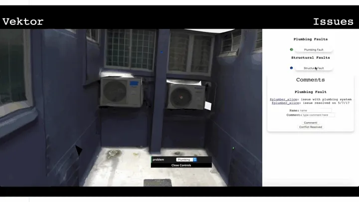 With the 3D model, the space can now be viewed in the browser. It can be explored, using normal mouse and movement keys. Issues can be seen and highlighted using the issue management system in the browser. The issues can be tagged with different problems or users, and multiple stakeholders can communicate in real time over problems in the space. The application is built using React and ThreeJS (a library to work with WebGL to manipulate 3D graphics).