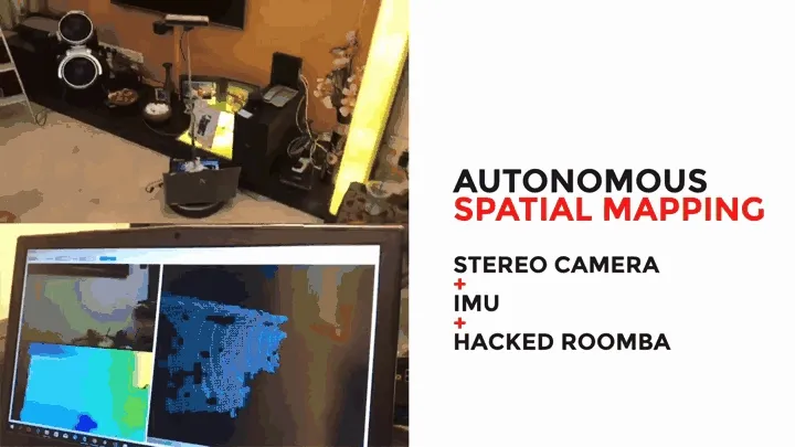 Using a stereo cam, with a built in IMU (inertial measurement unit) together with a roomba we had a robot that was able to do autonomous spatial mapping. The roomba would navigate around the room, while the stereo cam is used to map out the space in 3D. The computer attached constructs the model, and sends it to the browser.